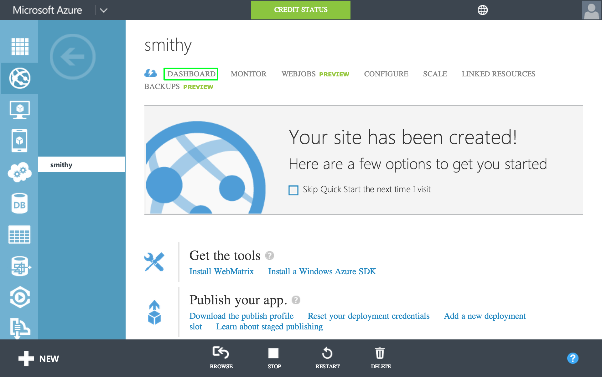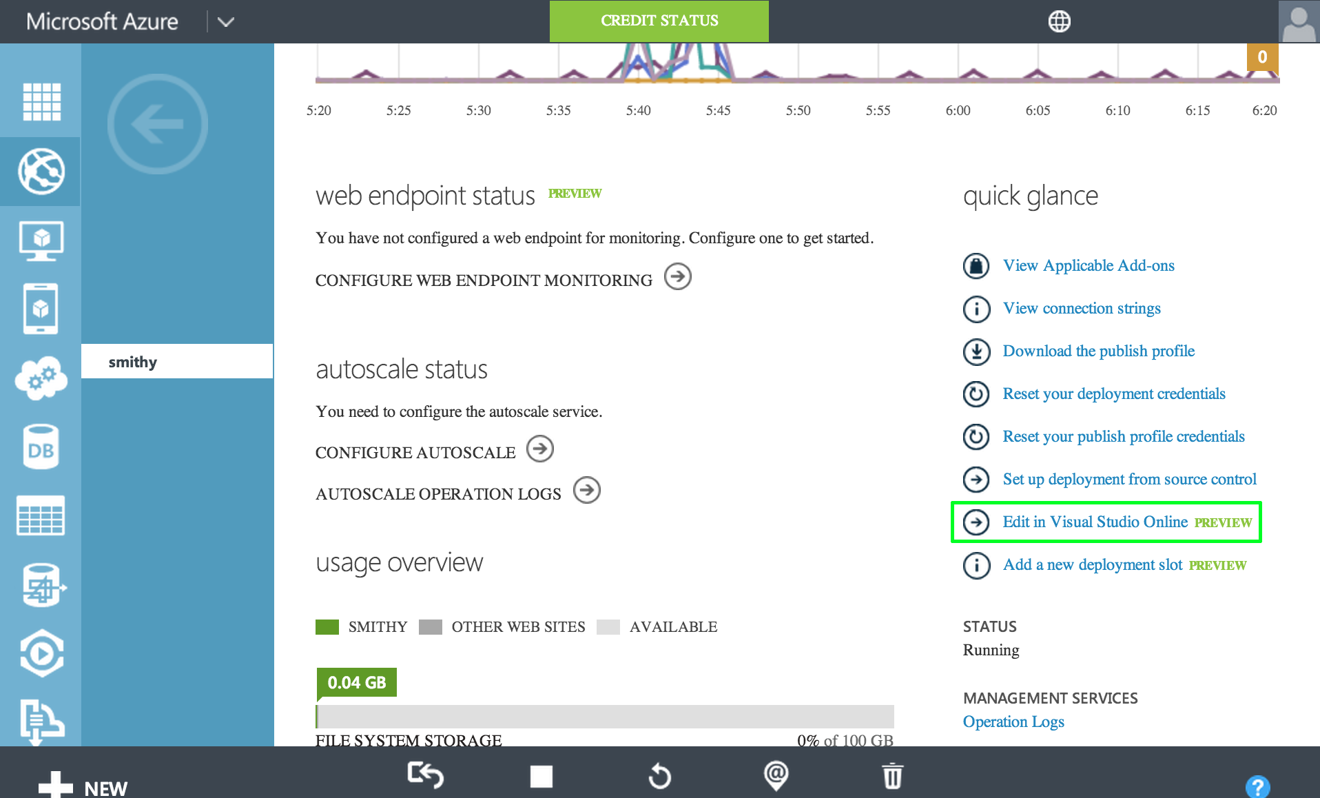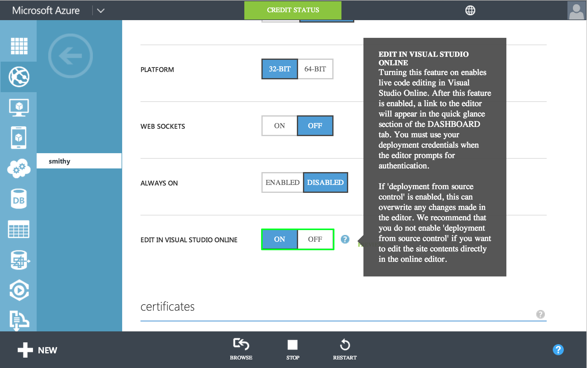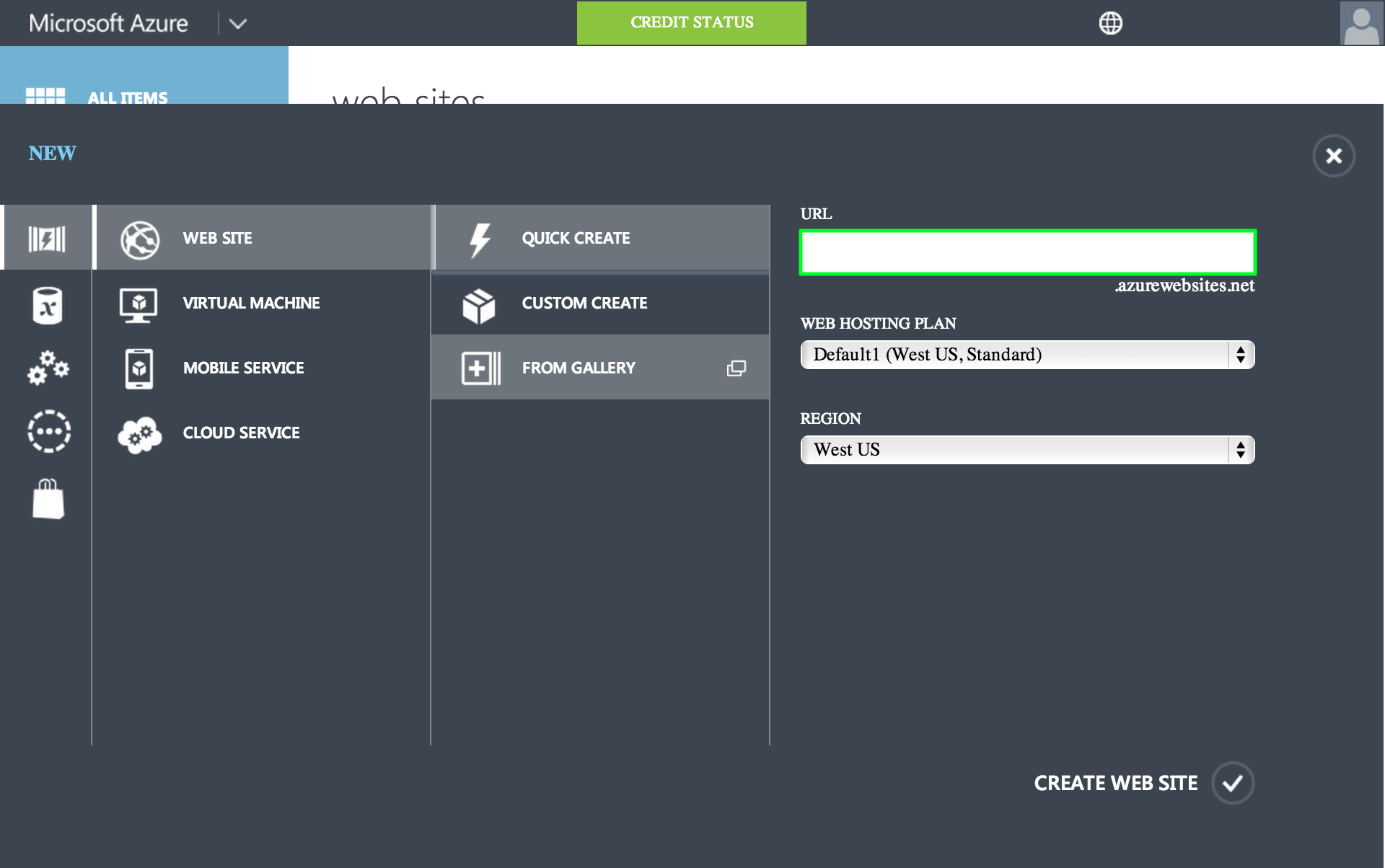 First, you need to log into the azure portal and create a new website. I don't think you can use a free website for this but not positive. NOTE: If you use shared, azure limits the resources you can use, so the IDE can stop working abruptly on you since the IDE just runs on top of your website.