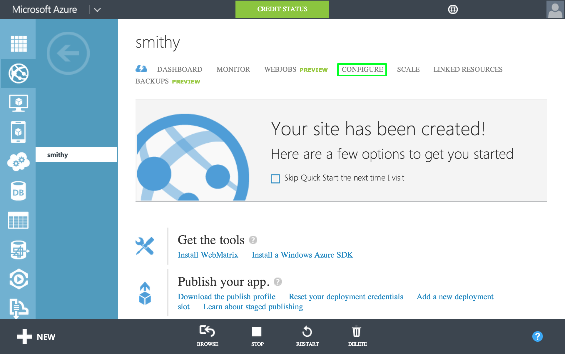 After you have created the website. Select it, and select CONFIGURE